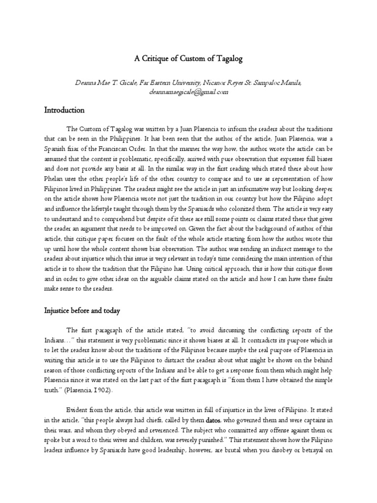 Story Critique Paper Example Tagalog Doc Analysis On Filipino Language Morphemes Jimmy Pedroza Academia Edu Use Specific Examples To Strengthen Your Critique from i0.wp.com A critique is the author's opinion of the article. A short and clear summary precedes the critique in this example. Ready to learn how to write a book critique like a boss? Article critique samples and examples are a good opportunity to make the writing process faster and simpler. Despite gilman's obvious intent to make the novel a feminist story with a dash of thriller thrown in, the result is instead a thriller. Social sites are examples that may assist an individual comprehend the situation better. For writing an effective article critique you must understand the subject of your critique, assess the structure, relevance of the topic, the author's style and other important features. These sites ask for personal details, and act as a passage for this.